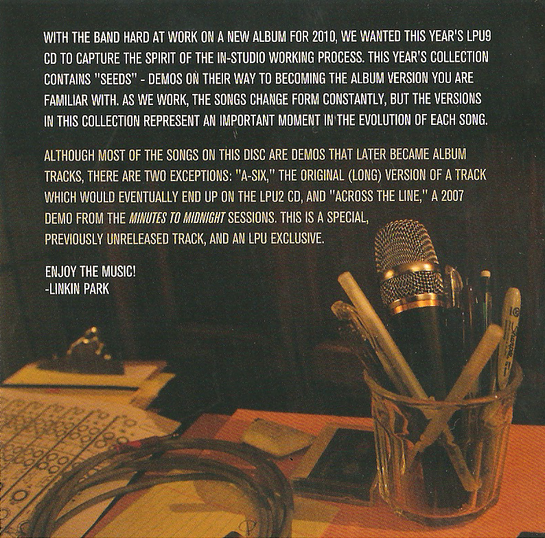 “Con la band che lavora duramente sul nuovo album per il 2010, abbiamo voluto che il CD dell’ LPU9 catturasse lo spirito del progresso di lavoro in studio. La collezione di quest’anno contiene “Seeds” – Demo sulla strada di diventare versioni che andranno in album, e con le quali voi avete familiarità. Come noi lavoriamo, le canzoni cambiano forma constantemente, ma le versioni in questa collezione rappresentano un importante momento nell’evoluzione di ogni canzone.