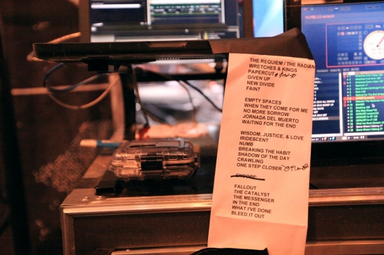 La foto più interessante è senza dubbio quella fatta nel backstage in cui possiamo vedere la setlist ed il computer di Joe. Su quest’ultimo, oltre alla setlist si possono notare gli scratch di Somewhere I Belong.
